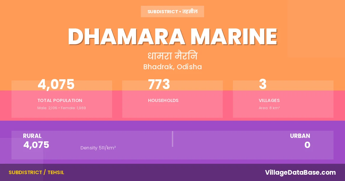 According to the 2011 census The total area of Dhamara Marine Tehsil is 8 km², with a population of 4075 people. The population density is 511 inhabitants per square kilometre, and there are approximately 773 houses in the sub district.