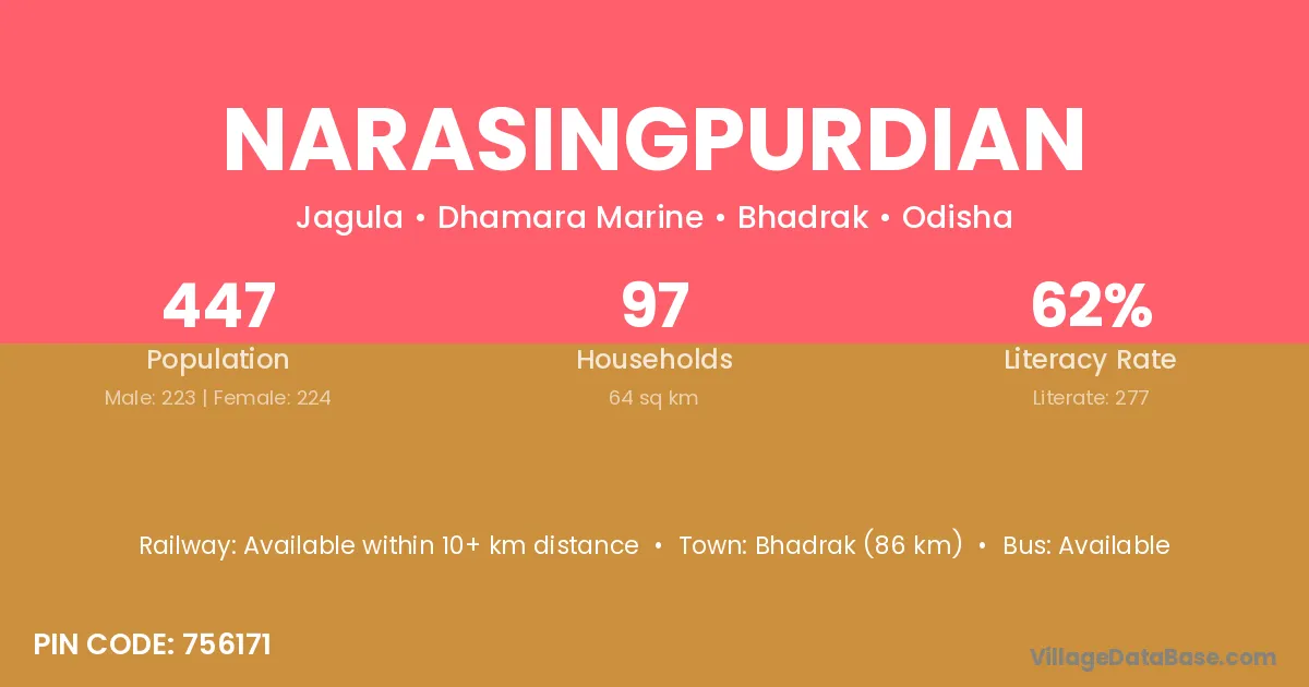 Bhadrak (86 km) is the nearest town to Narasingpurdian village for major economic activities and is located approximately 86 km away.