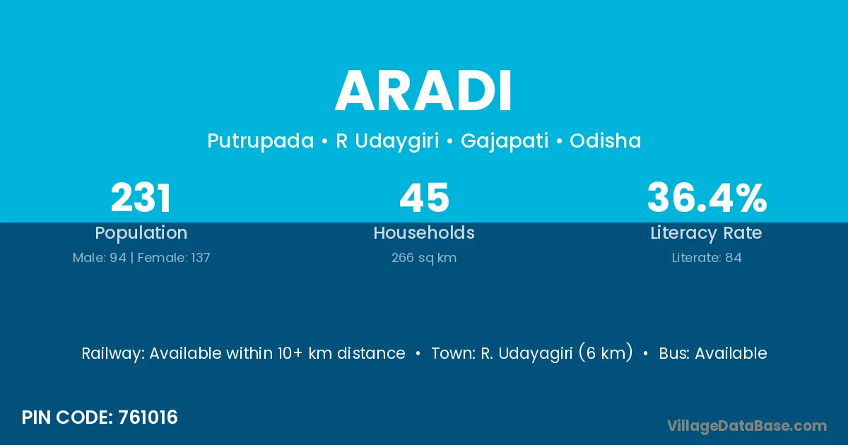 Bhadrak (35 km) is the nearest town to Aradi village for major economic activities and is located approximately 35 km away.