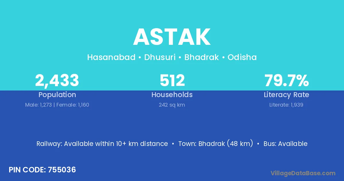 Bhadrak (48 km) is the nearest town to Astak village for major economic activities and is located approximately 48 km away.