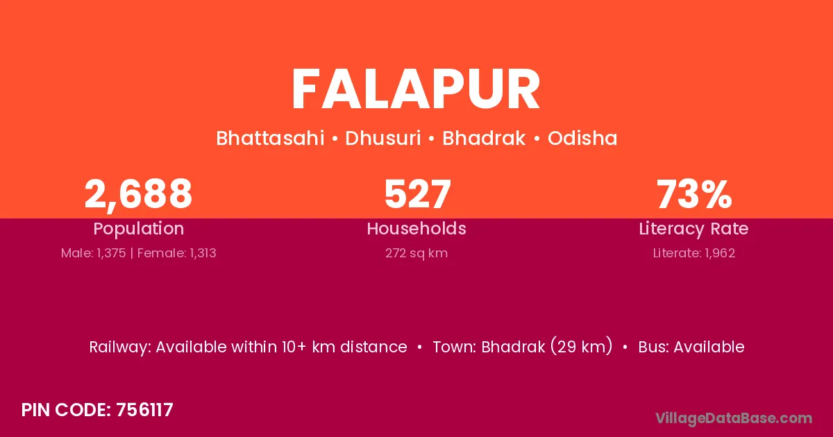Bhadrak (29 km) is the nearest town to Falapur village for major economic activities and is located approximately 29 km away.