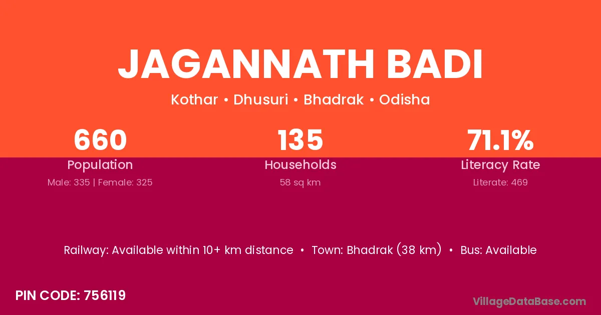 Jagannath Badi village has a total population of 660 people, of which 335 are males and 325 are females.