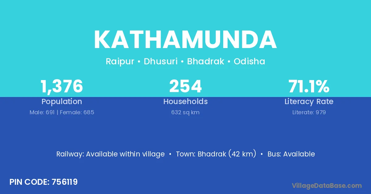 Bhadrak (42 km) is the nearest town to Kathamunda village for major economic activities and is located approximately 42 km away.