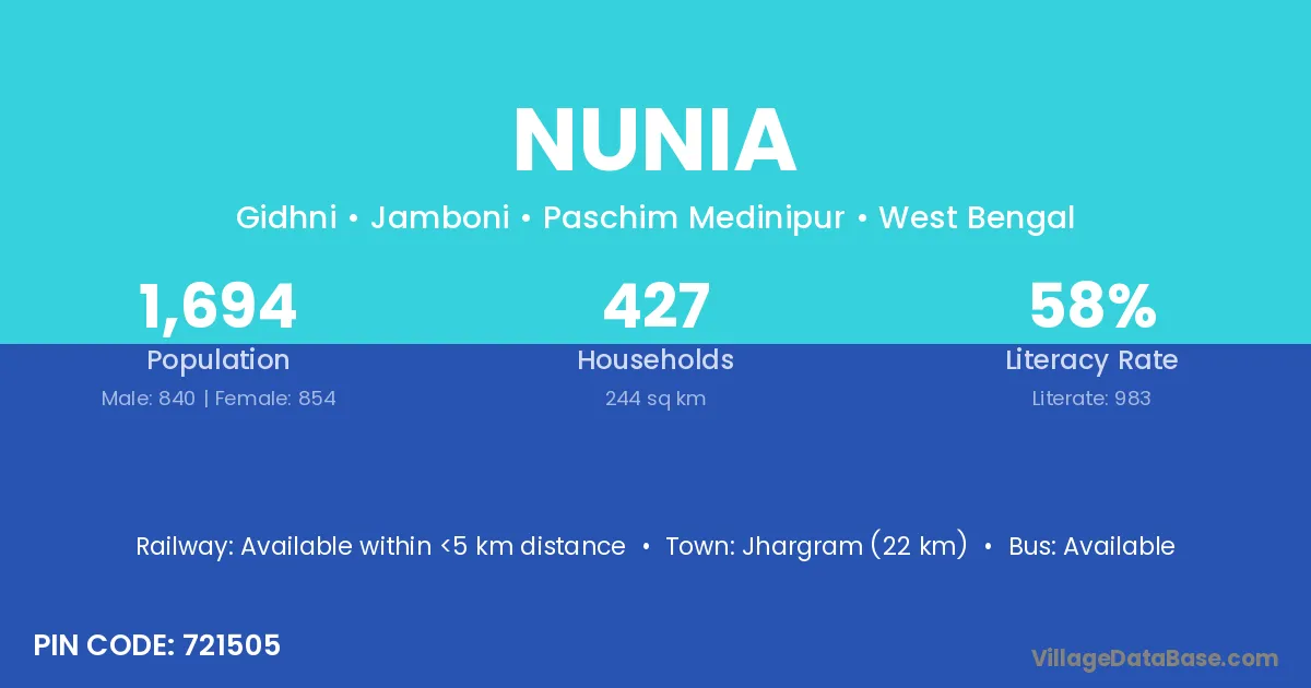 According to Census 2011 information, the village code of Nunia village is 756116.
