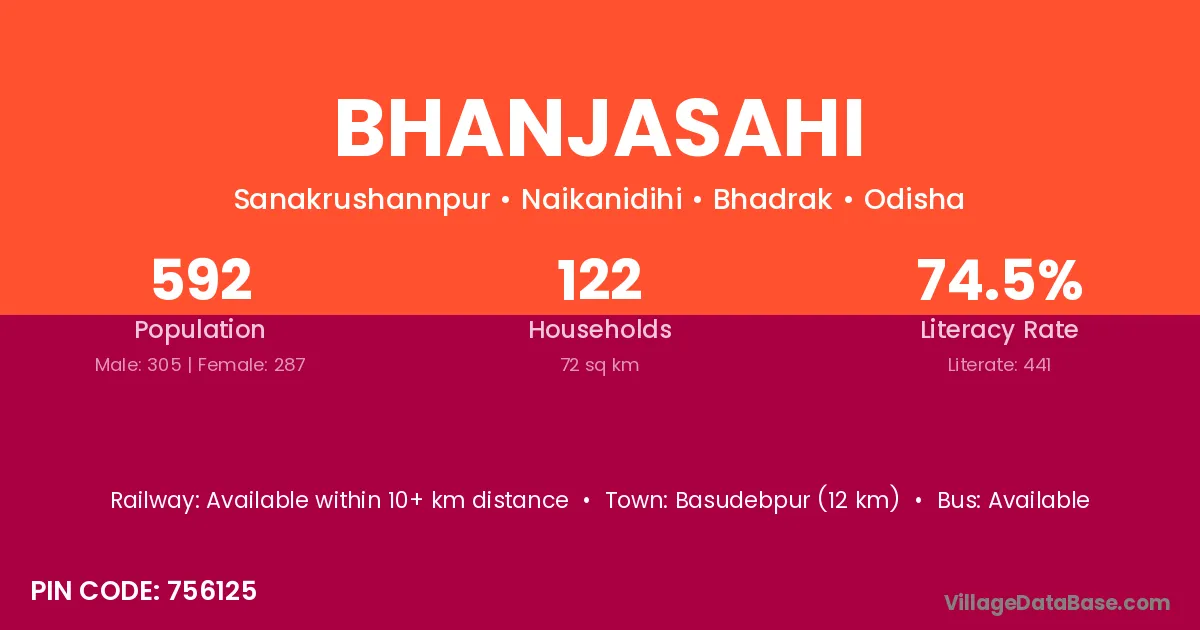 Basudebpur (12 km) is the nearest town to Bhanjasahi village for major economic activities and is located approximately 12 km away.