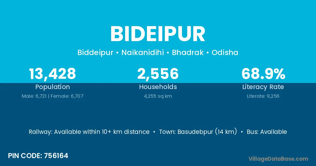 Bideipur village has a total population of 13,428 people, of which 6,721 are males and 6,707 are females.