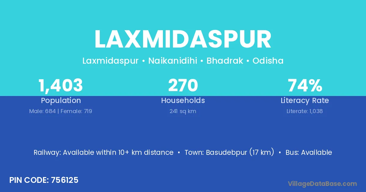 Basudebpur (17 km) is the nearest town to Laxmidaspur village for major economic activities and is located approximately 17 km away.