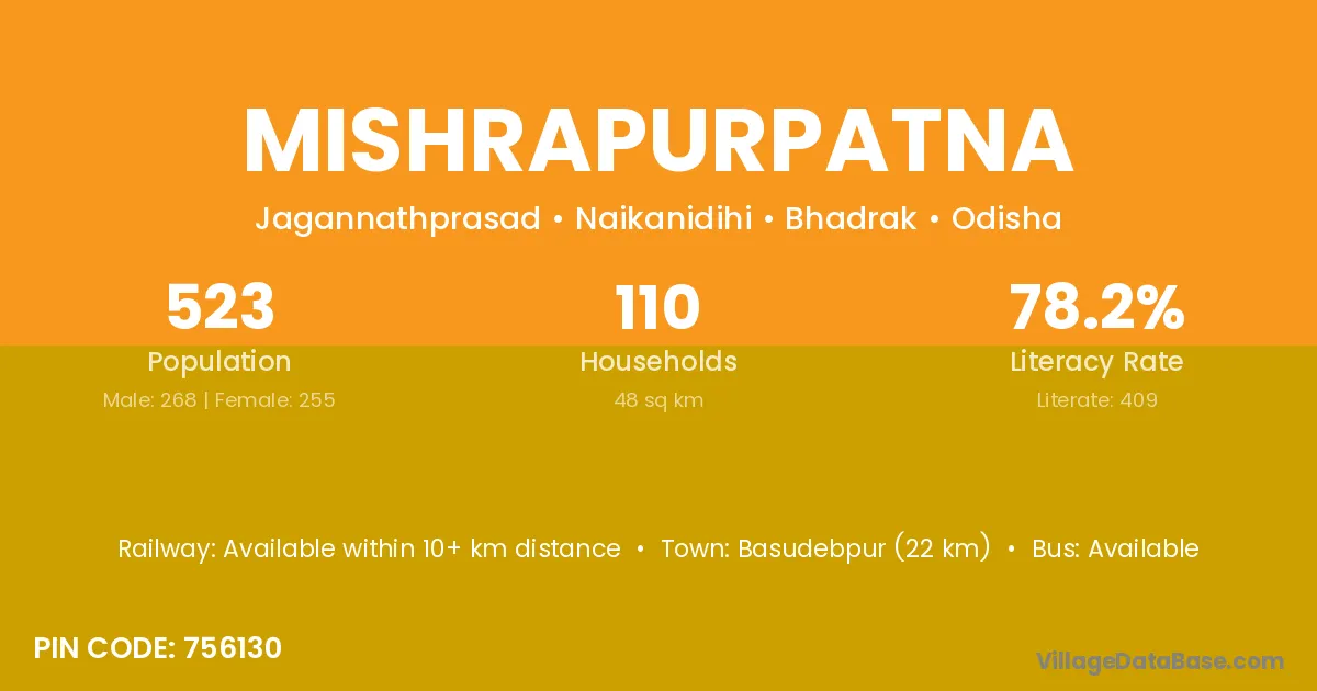 Mishrapurpatna village has a total population of 523 people, of which 268 are males and 255 are females.