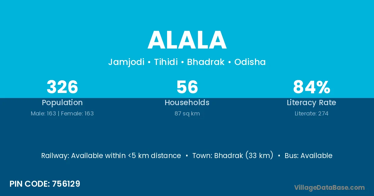 Bhadrak (33 km) is the nearest town to Alala village for major economic activities and is located approximately 33 km away.