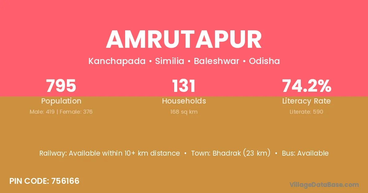 Bhadrak (38 km) is the nearest town to Amrutapur village for major economic activities and is located approximately 38 km away.