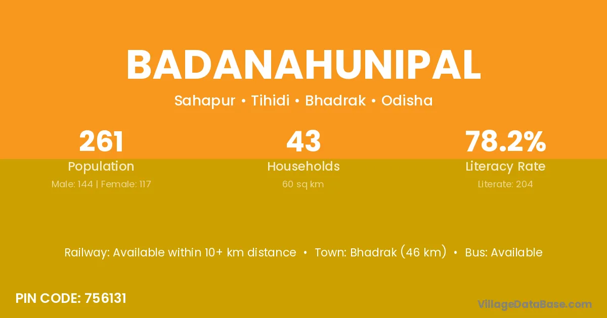 Bhadrak (46 km) is the nearest town to Badanahunipal village for major economic activities and is located approximately 46 km away.