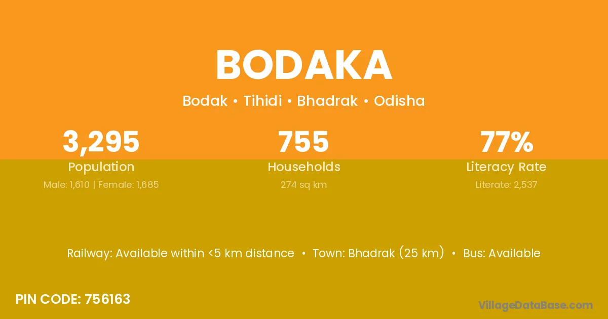 Bhadrak (25 km) is the nearest town to Bodaka village for major economic activities and is located approximately 25 km away.