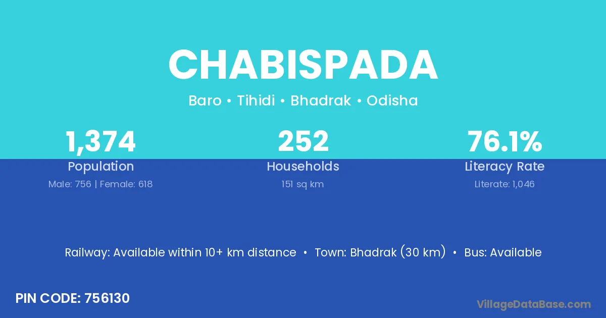 Bhadrak (30 km) is the nearest town to Chabispada village for major economic activities and is located approximately 30 km away.