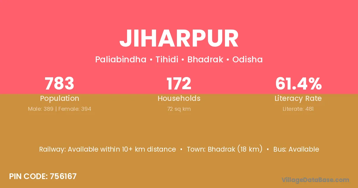Bhadrak (18 km) is the nearest town to Jiharpur village for major economic activities and is located approximately 18 km away.