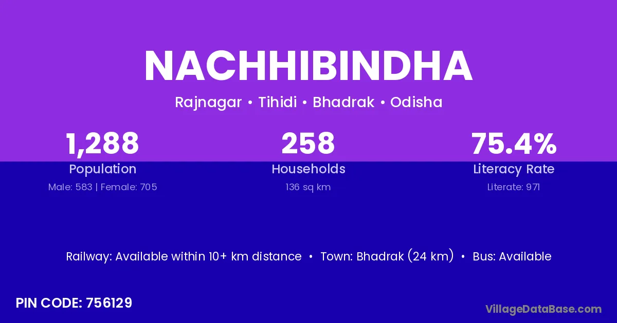 Bhadrak (24 km) is the nearest town to Nachhibindha village for major economic activities and is located approximately 24 km away.