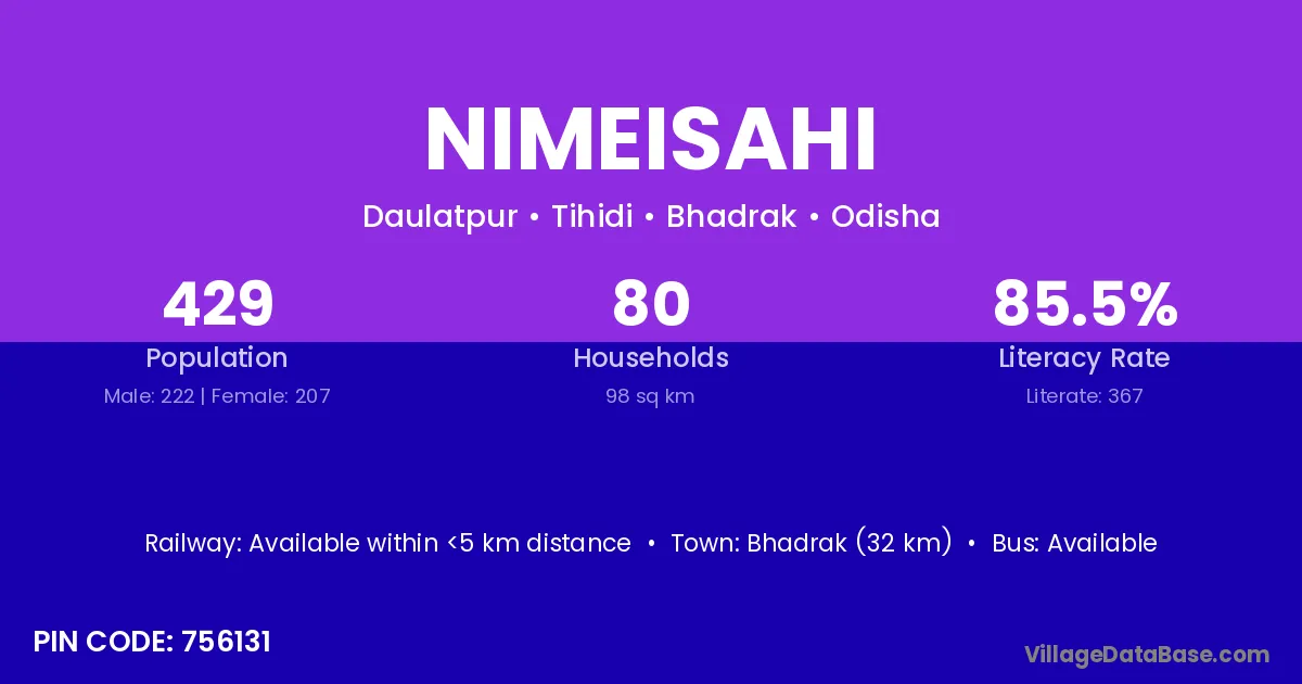 Bhadrak (32 km) is the nearest town to Nimeisahi village for major economic activities and is located approximately 32 km away.