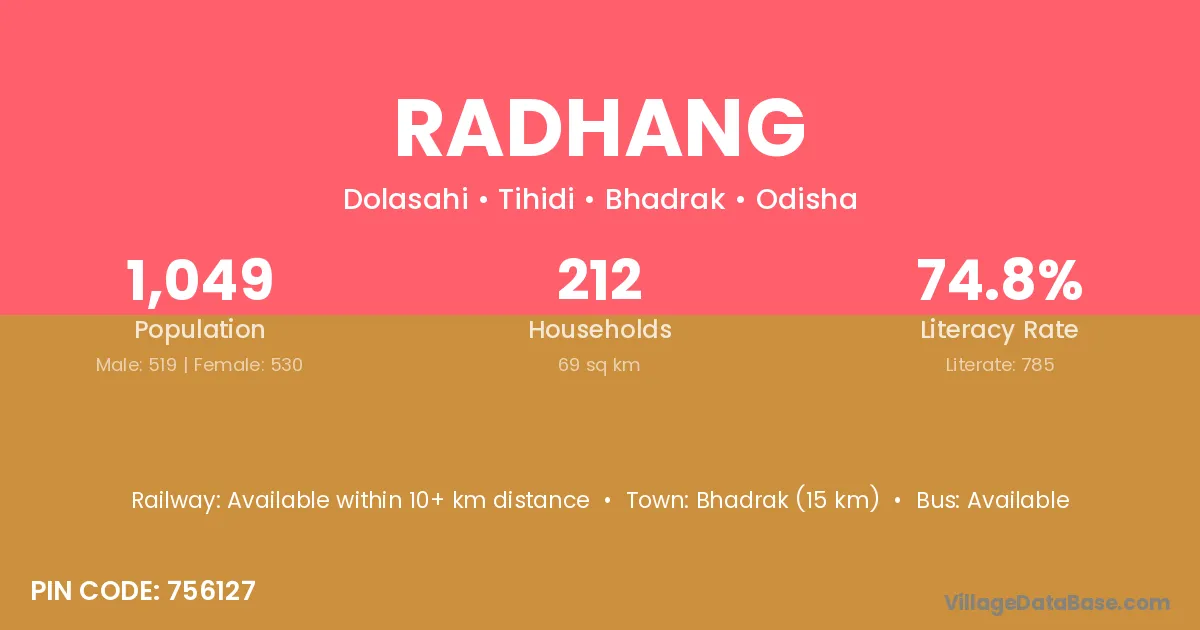 Bhadrak (15 km) is the nearest town to Radhang village for major economic activities and is located approximately 15 km away.