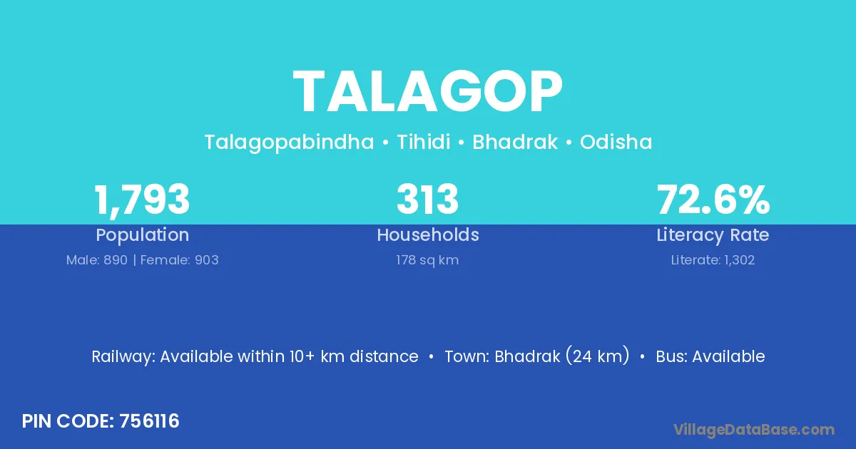 Bhadrak (24 km) is the nearest town to Talagop village for major economic activities and is located approximately 24 km away.