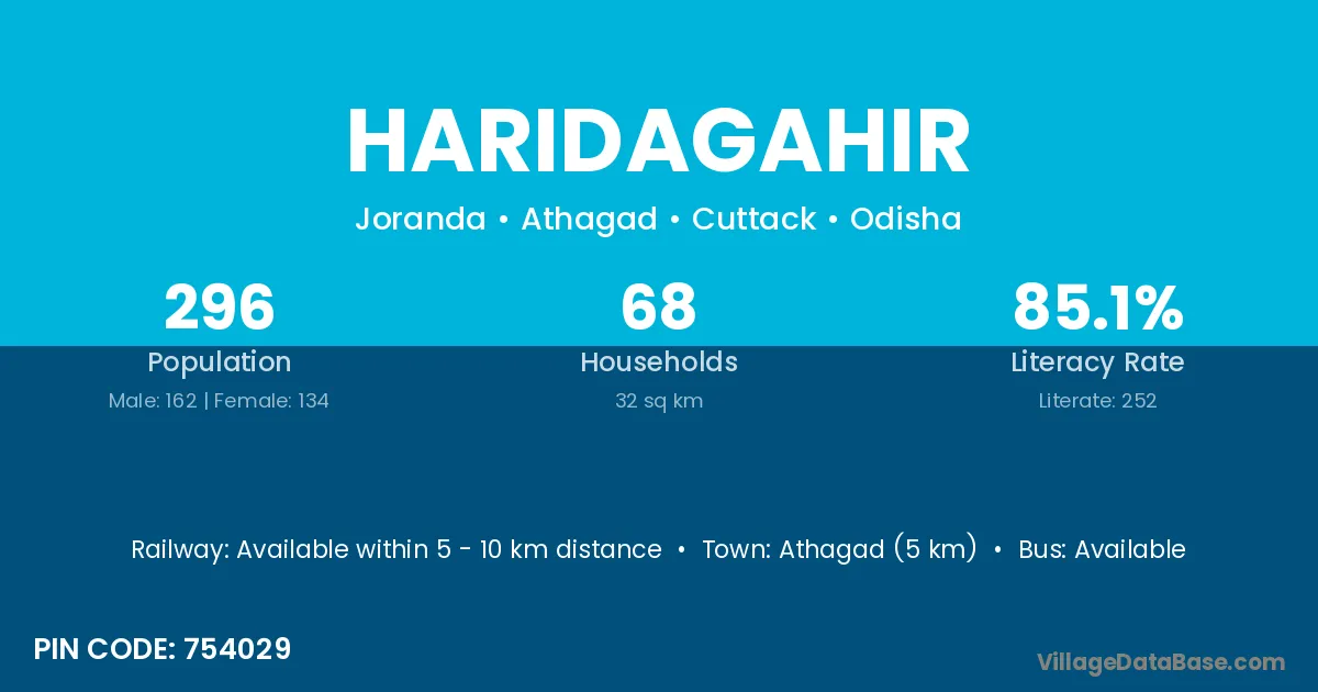 Athagad (5 km) is the nearest town to Haridagahir village for major economic activities and is located approximately 5 km away.