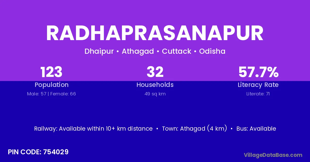 Athagad (4 km) is the nearest town to Radhaprasanapur village for major economic activities and is located approximately 4 km away.