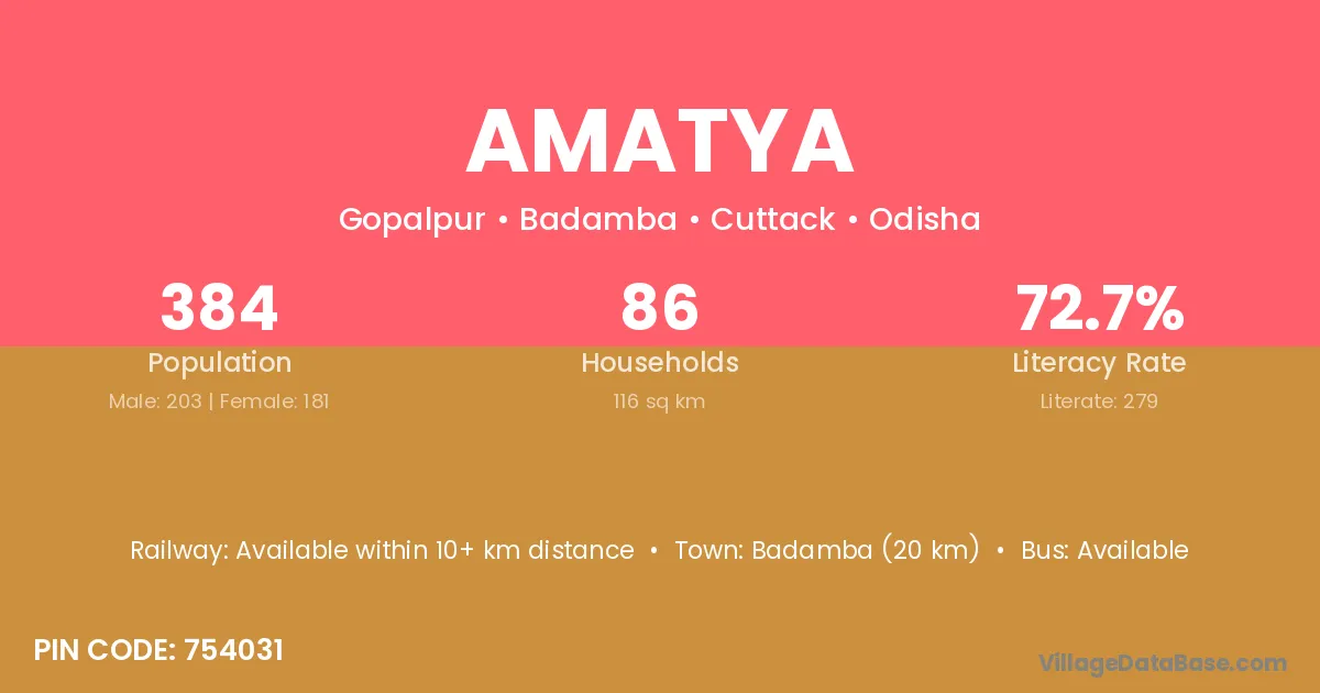 Badamba (20 km) is the nearest town to Amatya village for major economic activities and is located approximately 20 km away.