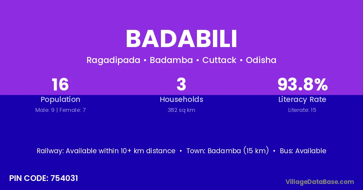 Badamba (15 km) is the nearest town to Badabili village for major economic activities and is located approximately 15 km away.