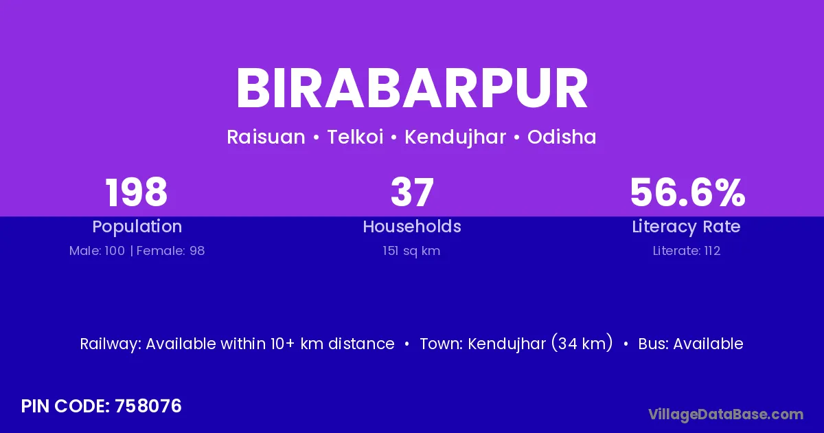 Athagad (22 km) is the nearest town to Birabarpur village for major economic activities and is located approximately 22 km away.