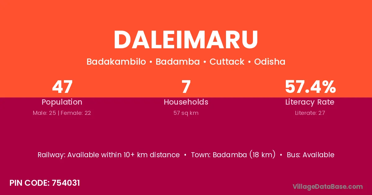 Badamba (18 km) is the nearest town to Daleimaru village for major economic activities and is located approximately 18 km away.