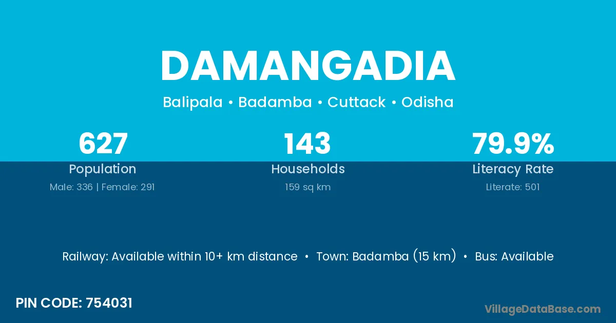 Badamba (15 km) is the nearest town to Damangadia village for major economic activities and is located approximately 15 km away.