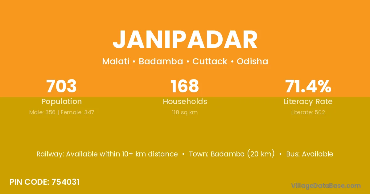 Janipadar village has a total population of 703 people, of which 356 are males and 347 are females.