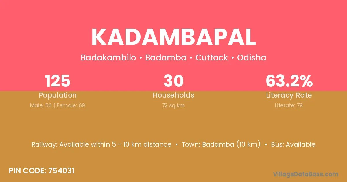 Badamba (10 km) is the nearest town to Kadambapal village for major economic activities and is located approximately 10 km away.