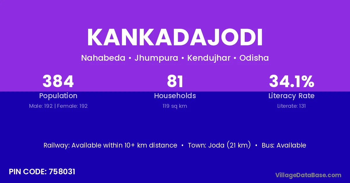 Kankadajodi village has a total population of 3,964 people, of which 2,067 are males and 1,897 are females.