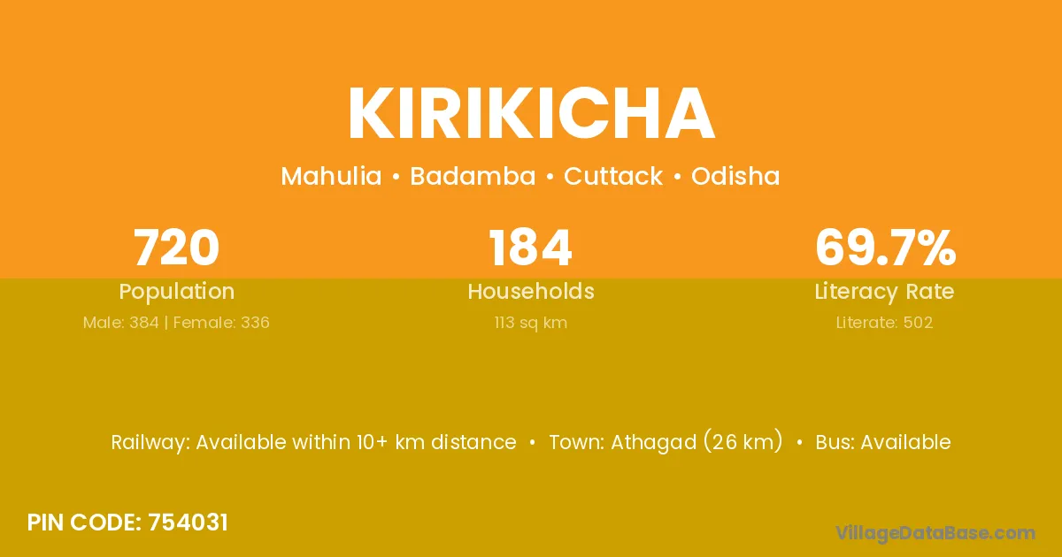 Kirikicha village has a total population of 720 people, of which 384 are males and 336 are females.