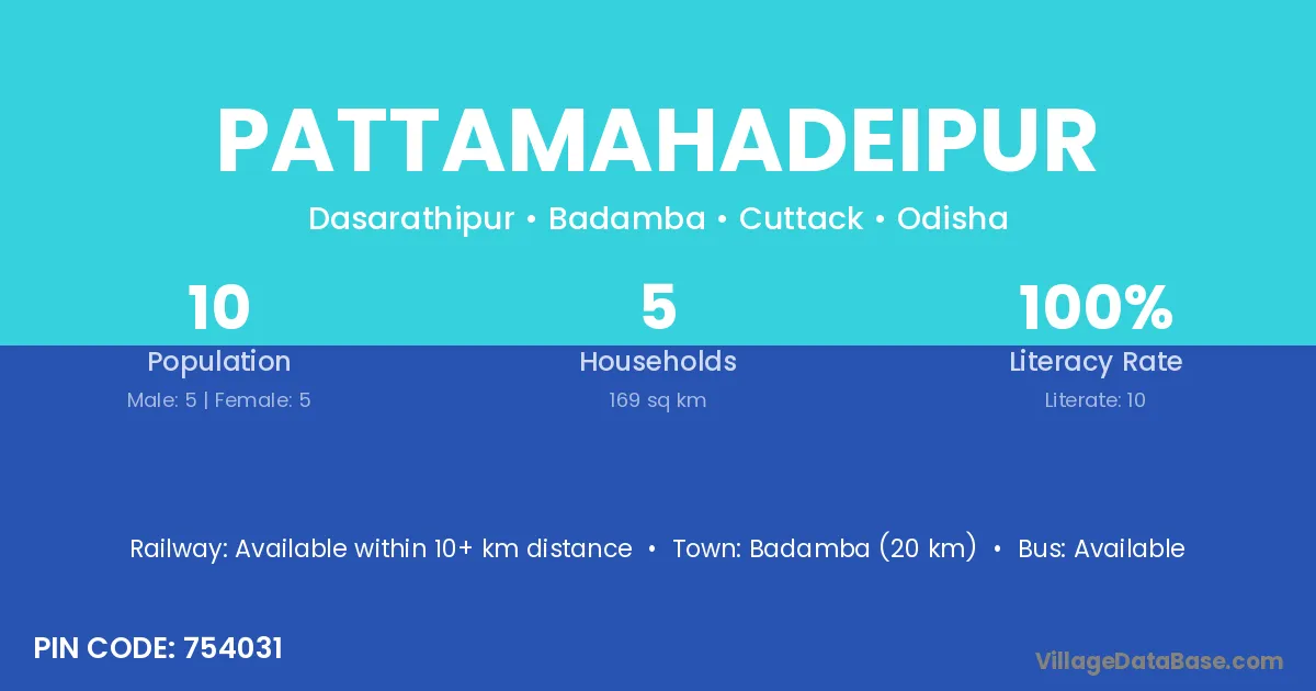 Badamba (20 km) is the nearest town to Pattamahadeipur village for major economic activities and is located approximately 20 km away.