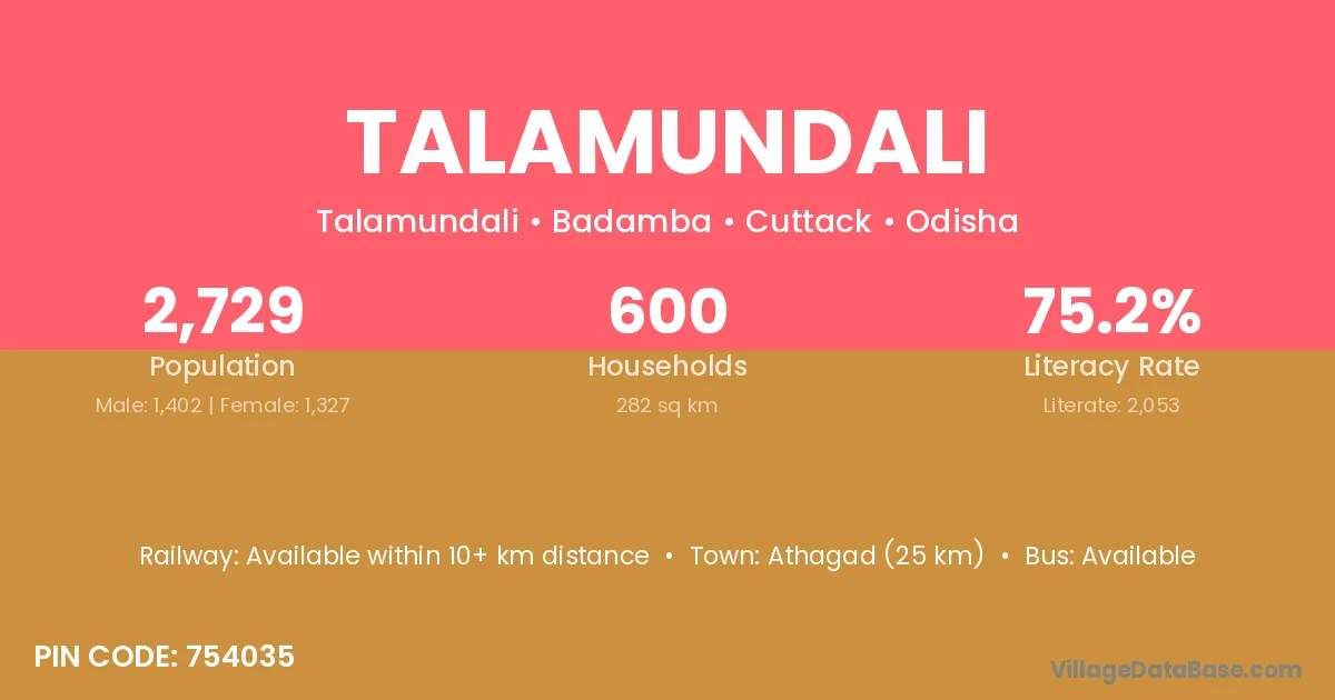 Athagad (25 km) is the nearest town to Talamundali village for major economic activities and is located approximately 25 km away.