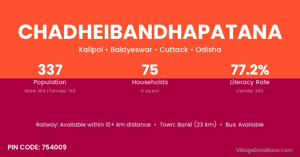 Banki (23 km) is the nearest town to Chadheibandhapatana village for major economic activities and is located approximately 23 km away.