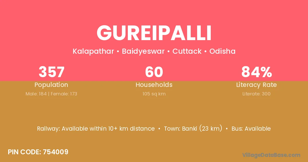 Banki (23 km) is the nearest town to Gureipalli village for major economic activities and is located approximately 23 km away.
