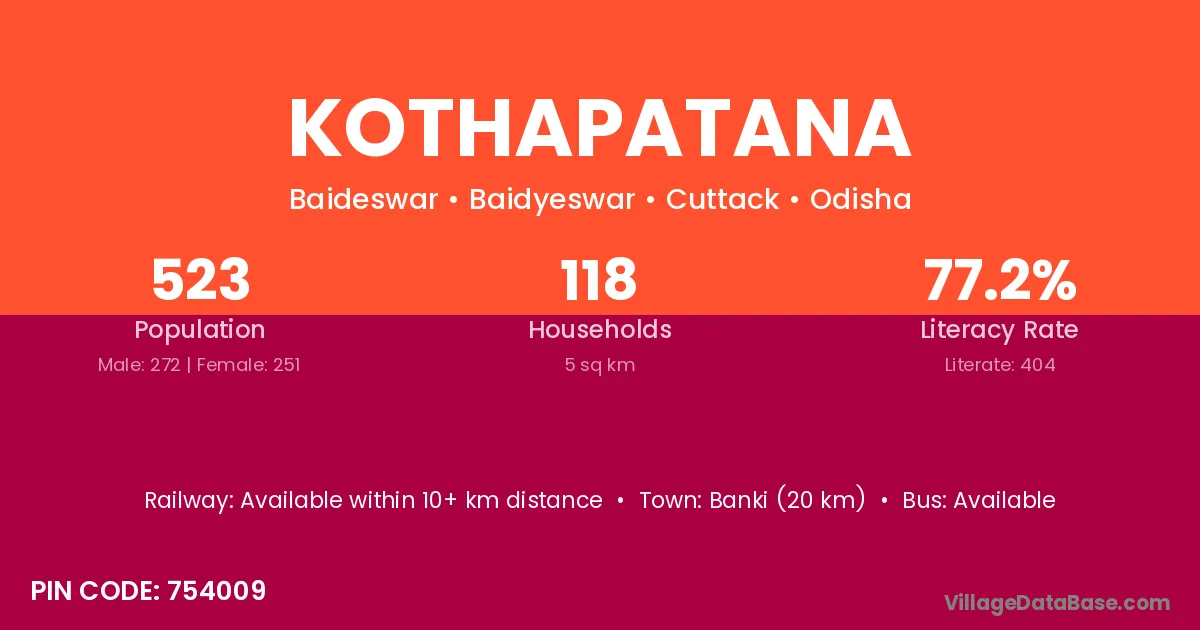 Banki (20 km) is the nearest town to Kothapatana village for major economic activities and is located approximately 20 km away.