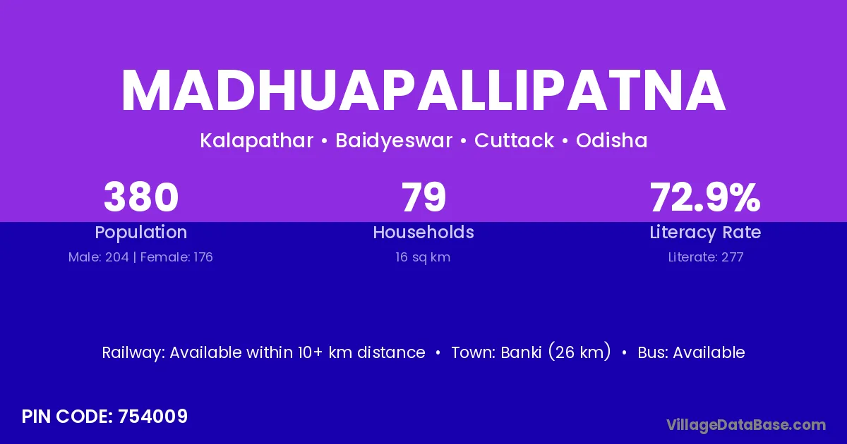 Banki (26 km) is the nearest town to Madhuapallipatna village for major economic activities and is located approximately 26 km away.