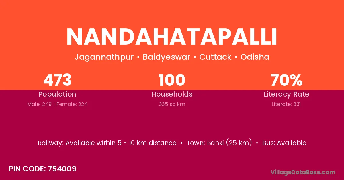Banki (25 km) is the nearest town to Nandahatapalli village for major economic activities and is located approximately 25 km away.