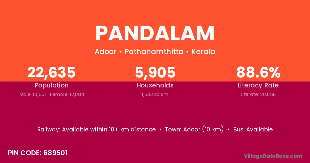 Banki (23 km) is the nearest town to Pandalam village for major economic activities and is located approximately 23 km away.