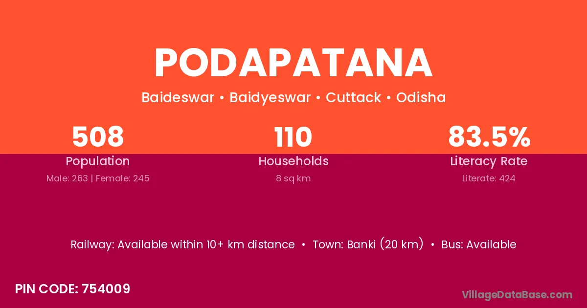 Banki (20 km) is the nearest town to Podapatana village for major economic activities and is located approximately 20 km away.