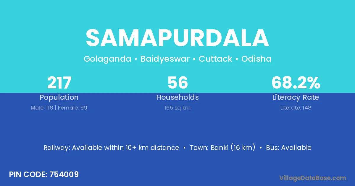 Banki (16 km) is the nearest town to Samapurdala village for major economic activities and is located approximately 16 km away.