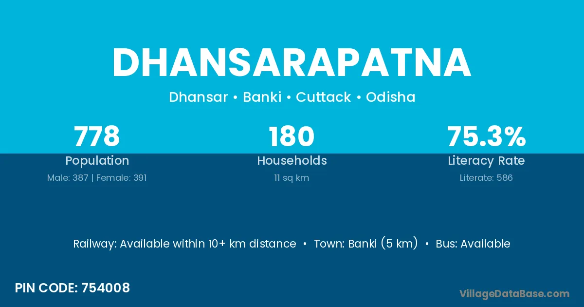 Banki (5 km) is the nearest town to Dhansarapatna village for major economic activities and is located approximately 5 km away.