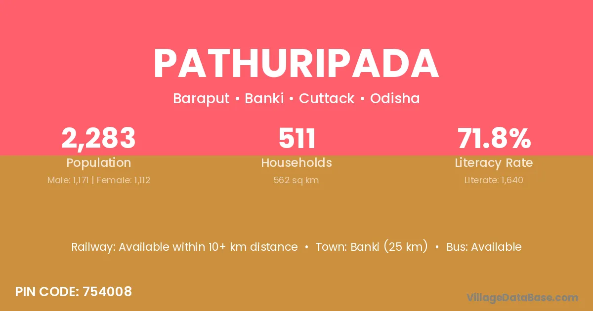 Banki (25 km) is the nearest town to Pathuripada village for major economic activities and is located approximately 25 km away.