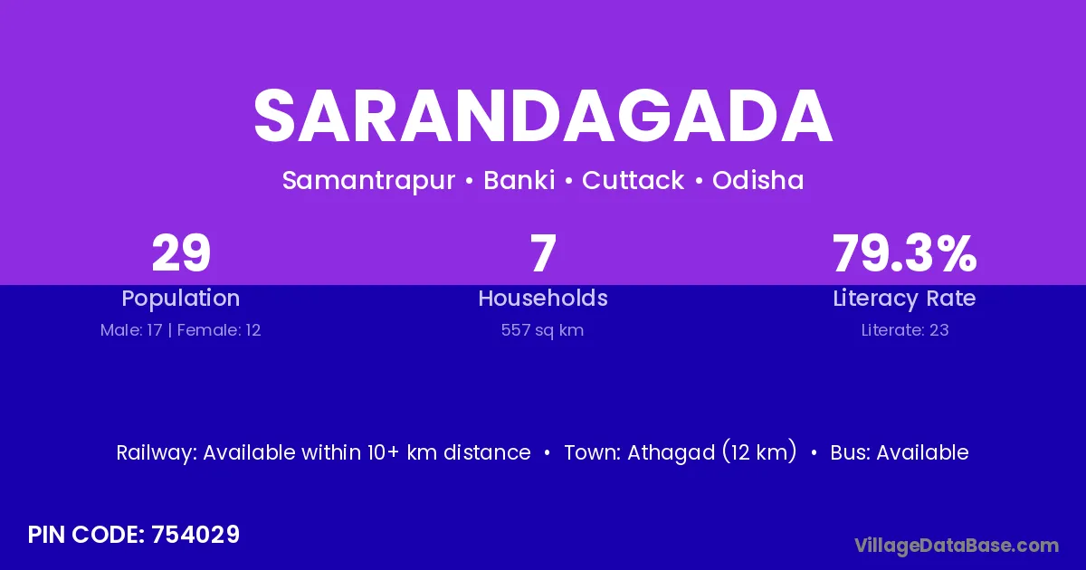 Athagad (12 km) is the nearest town to Sarandagada village for major economic activities and is located approximately 12 km away.
