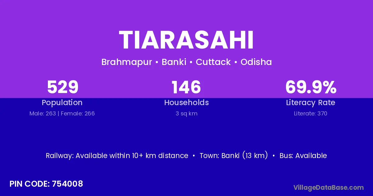 Banki (13 km) is the nearest town to Tiarasahi village for major economic activities and is located approximately 13 km away.