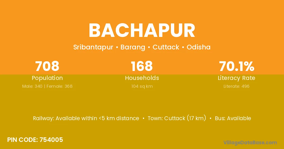 Cuttack (17 km) is the nearest town to Bachapur village for major economic activities and is located approximately 17 km away.