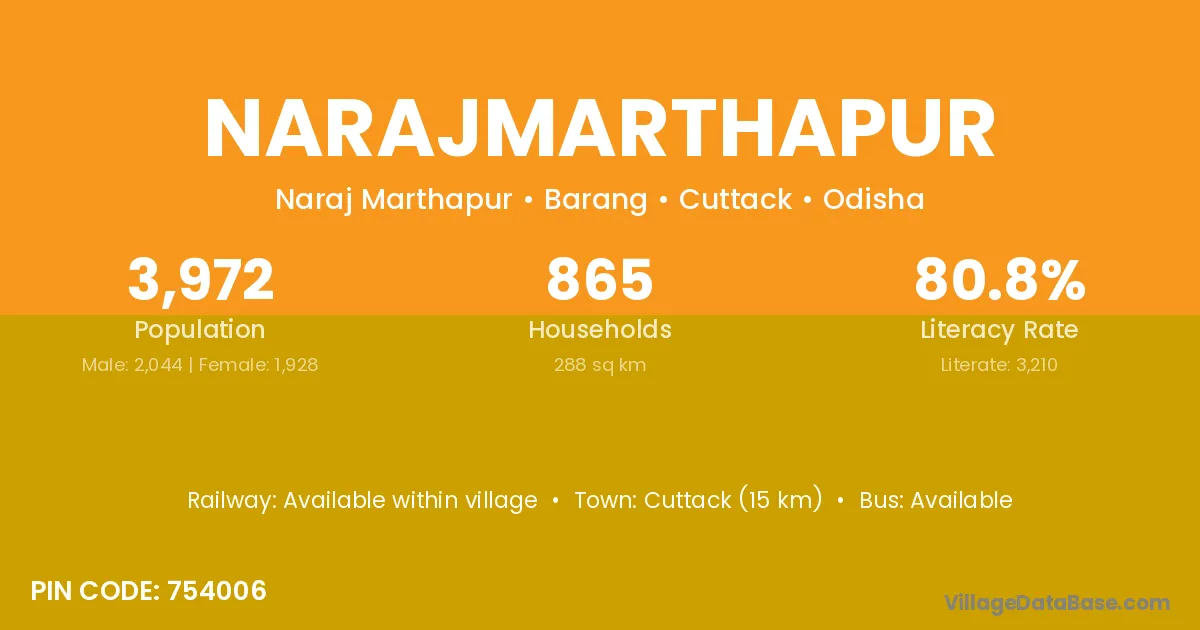 Cuttack (15 km) is the nearest town to Narajmarthapur village for major economic activities and is located approximately 15 km away.