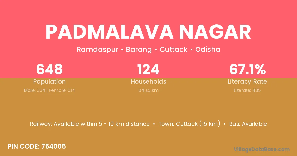 Cuttack (15 km) is the nearest town to Padmalava Nagar village for major economic activities and is located approximately 15 km away.